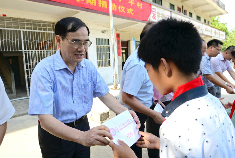 6月5日,市政協副主席黃定嵩(左一)到欽北區平吉鎮廣平村小學開展2017年張原天博士獎學金春季學期捐助儀式。 鄧吳宇 攝。